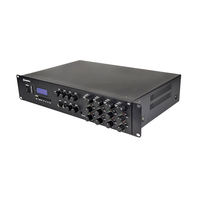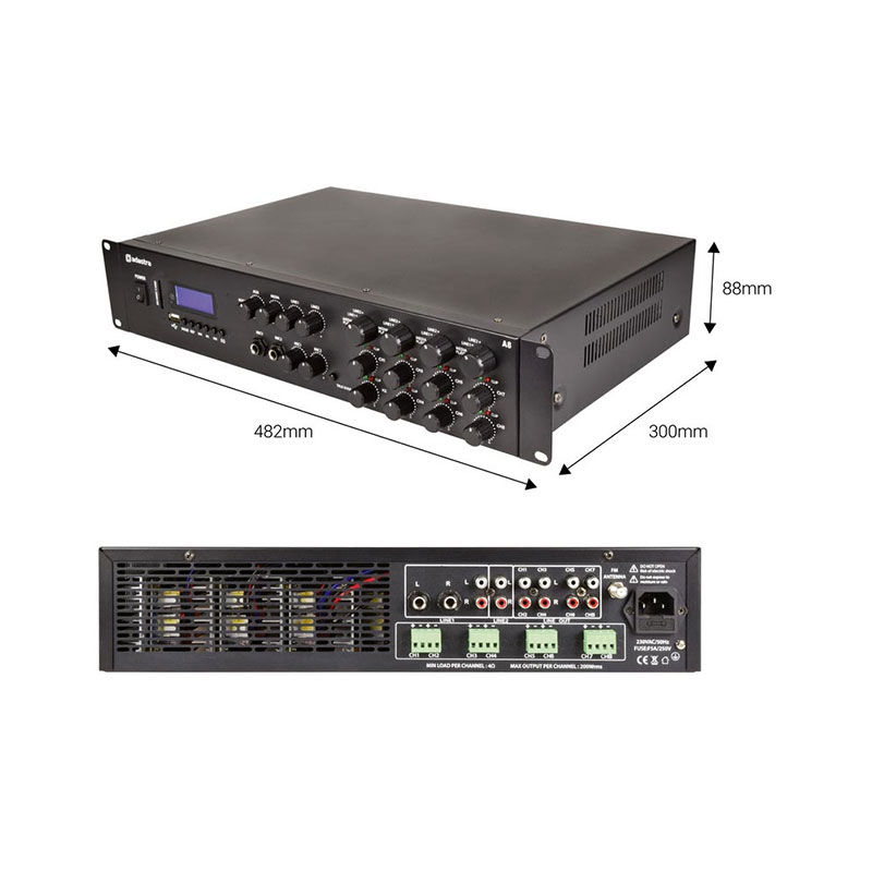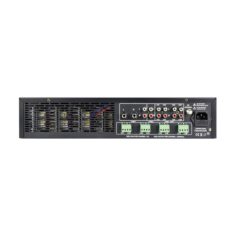 Ενισχυτές πολλαπλών ζωνών με 2 εισόδους μικροφώνου και εναλλασσόμενη στερεοφωνική είσοδο για κάθε ζώνη. Μια ενσωματωμένη ενότητα αναπαραγωγής πολυμέσων προσφέρει αναπαραγωγή κομματιών mp3 από μονάδα USB ή κάρτα SD και διαθέτει επίσης ασύρματο δέκτη B/T και δέκτη ραδιοφώνου FM. Ένας περιστροφικός διακόπτης για κάθε ζώνη εξόδου επιλέγει τον στερεοφωνικό ήχο αναπαραγωγής από μια επιλογή από 2 πίσω στερεοφωνικές εισόδους, μια μπροστινή στερεοφωνική είσοδο 3,5 mm ή την ενσωματωμένη συσκευή αναπαραγωγής πολυμέσων. Οι είσοδοι μικροφώνου 1 και 2 είναι ζωντανά σε όλες τις ζώνες εξόδου ανά πάσα στιγμή. Τα ηχεία συνδέονται από τους ακροδέκτες Euroblock του πίσω πλαισίου για απόδοση έως και 200 W ανά έξοδο στα 4 Ohm. Σχεδιασμένο για εγκαταστάσεις που απαιτούν στερεοφωνικό ήχο υψηλής ποιότητας σε πολλά δωμάτια ή χώρους ακρόασης.