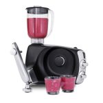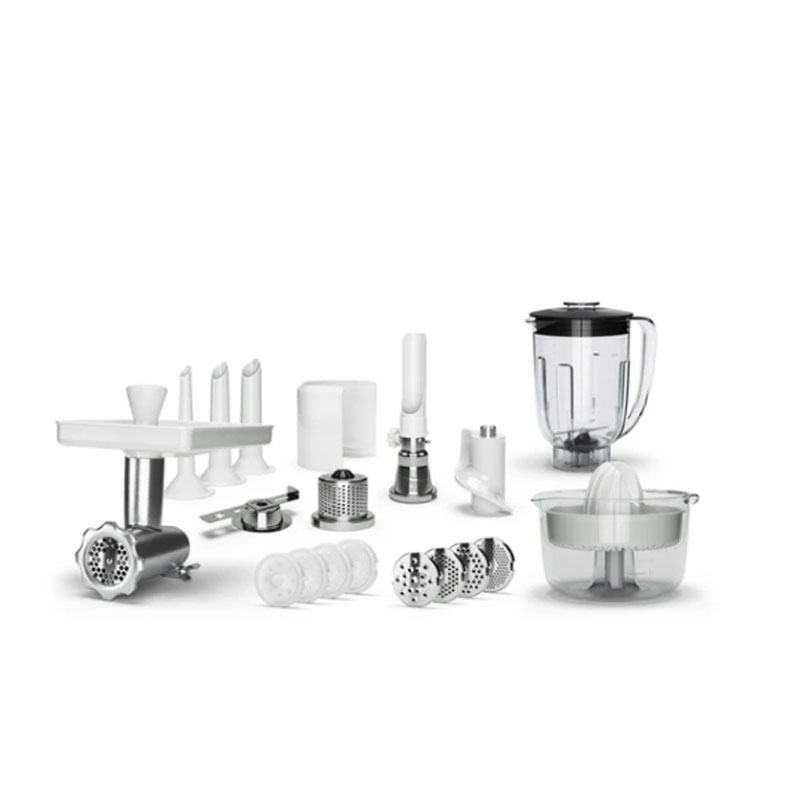 Το μεγάλο πακέτο αξεσουάρ DeLuxe περιέχει μηχανή κιμά, 3 κέρατα λουκάνικου 10/20/25mm, δίσκο τροφοδοσίας, βύσμα τροφοδοσίας, πλάκες δίσκου 4x οπών 2,5/4,5/6/8mm, σουρωτήρι, τρίφτη, δίσκους ζυμαρικών, εξάρτηματα για μπισκότα, μπλέντερ, λεμονοστίφτη, προστατευτικό για τη μηχανή κιμά.