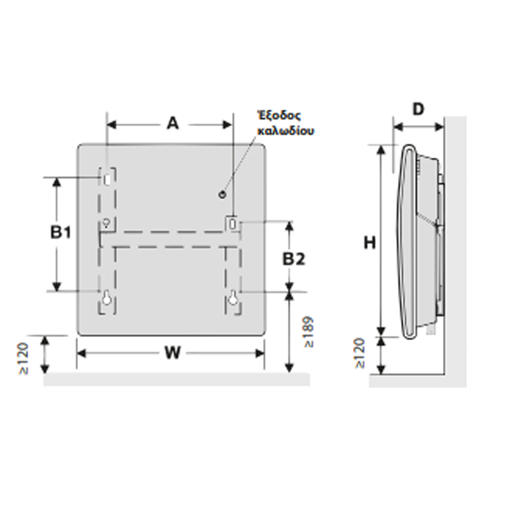 Περιλαμβάνει βάση στήριξης τοίχου (σε σχήμα Η) για απλή και εύκολη επιτοίχια εγκατάσταση Ο θερμοπομπός τοποθετείται χαμηλά, 12 εκατοστά από το δάπεδο