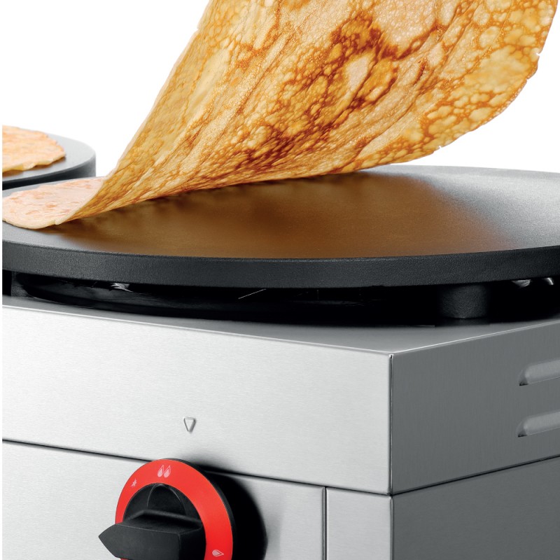 Οι πλάκες κρέπας από μαντέμι αποτελούν την καλύτερη προϋπόθεση για την επίτευξη μιας πολύ λεπτής και ζουμερής κρέπας με ελαφρώς ροδισμένο χρώμα. Με τη βοήθεια του πολύ εύκολου χειρισμού που διαθέτει , μπορείτε να φτιάξετε κρέπες στις δύο επιστρωμένες πλάκες μεγέθους 40 cm σε 2 διαφορετικές βαθμίδες απόδοσης.