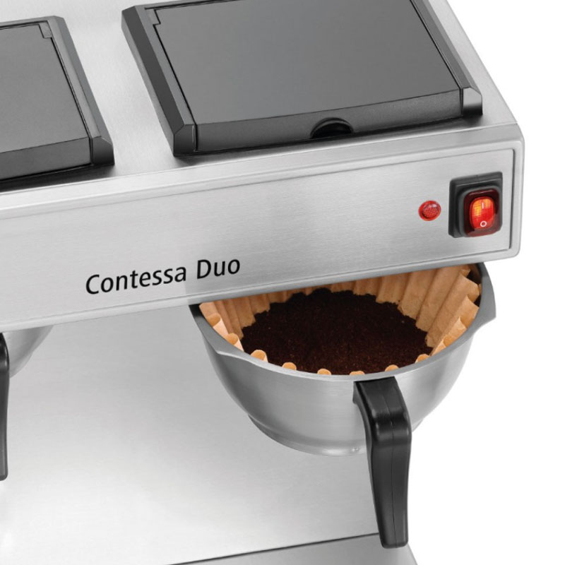 Η τέλεια μηχανή καφέ για τη διάθεση φίλτρου καφέ σε μπουφέ, κέτερινγκ ή εκδηλώσεις. Με την Contessa Duo μπορείτε να ετοιμάσετε έως και 13 φλιτζάνια ανά εστία απευθείας στην ισοθερμική κανάτα. Τα βελτιωμένα θερμαντικά στοιχεία από ανοξείδωτο χάλυβα προσφέρουν βέλτιστη μετάδοση θερμότητας.