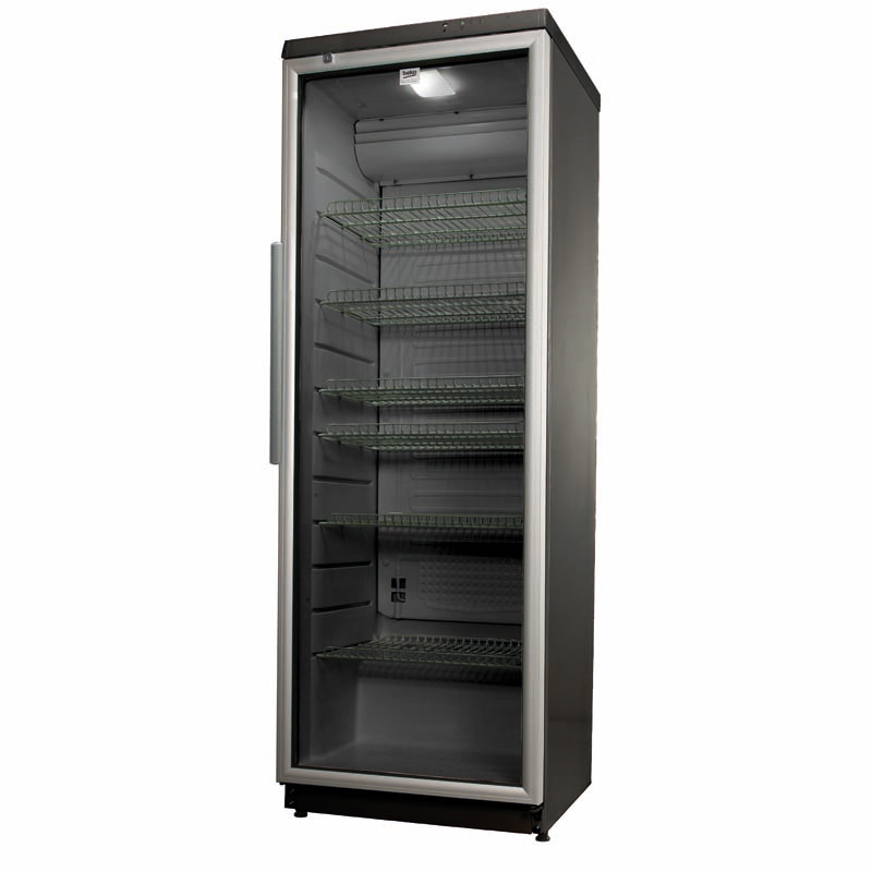Ψυγείο με γυάλινη πόρτα σχεδιασμένο για την αποθήκευση και έκθεση τροφίμων ή ποτών. Ιδανικό για μπαρ, παμπ και εστιατόρια. Εξοπλισμένο με αυτόματο σύστημα απόψυξης και αυτόματη εξάτμιση νερού. Με εξαερισμό. Σκούρο γκρι χρώμα εξωτερικά και εσωτερικά. Μέγιστη θερμοκρασία περιβάλλοντος 32°C. Διπλή γυάλινη πόρτα με ανθεκτική λαβή. Κλειδαριά πόρτας. Πλαίσιο πόρτας από αλουμίνιο. Ρυθμιζόμενα ράφια και πόδια. Μηχανικός έλεγχος με θερμόμετρο. Ενεργειακή κλάση D. Βύσμα τύπου Schuko.