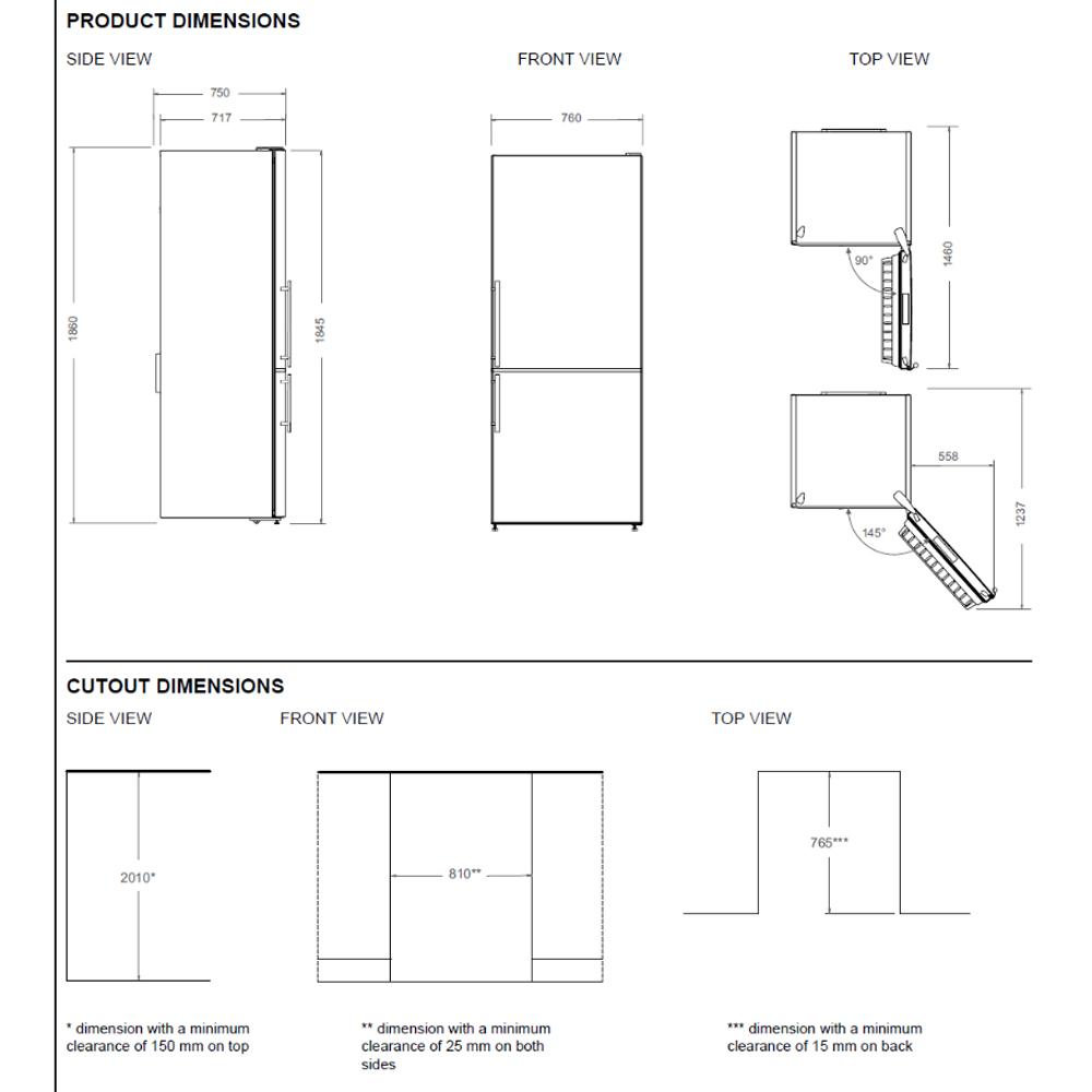 Διαστάσεις συσκευής (ΥxΠxΒ) - Βάθος με ανοιχτή πόρτα 186,0 x 76,0 x 75,0 - 146,0εκ.