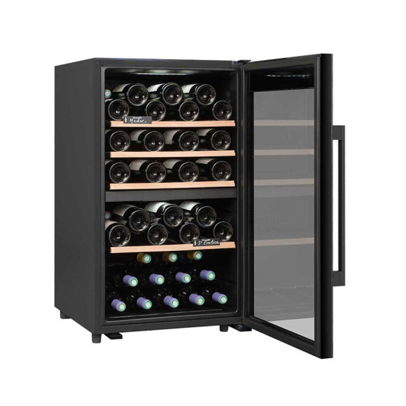 Το μαύρο του κελαριού και το φυσικό ξύλο των ραφιών συνδυάζονται με το στυλ και προσθέτουν χαρακτήρα στη συσκευή. Ο λευκός φωτισμός LED σας προσκαλεί να κοιτάξετε και να δοκιμάσετε. Ένας διακόπτης σάς επιτρέπει να απενεργοποιήσετε τον φωτισμό εάν το επιθυμείτε.