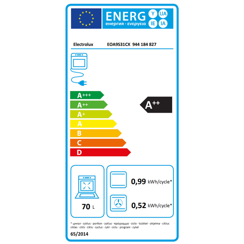 Ενεργειακή κατανάλωση σε πρότυπο φορτίο, λειτουργία θερμού αέρα (kWh/κύκλο) - Πάνω φούρνος: 0.52