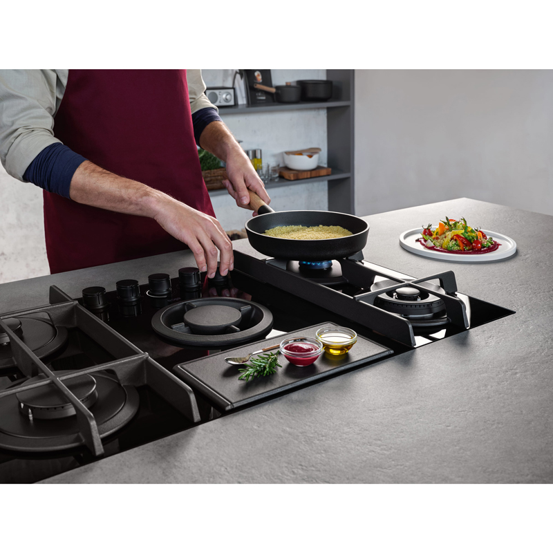 Η μαγεία της φλόγας συνδυάζεται με την ισχυρή τεχνολογία. Παρουσιάζουμε την πρώτη εστία με απορροφητήρα αερίου που συνδυάζει σύστημα απορρόφησης από κάτω με συμβατικούς καυστήρες. Με απόλυτη ασφάλεια: η συσκευή συμμορφώνεται με όλους τους κανονισμούς για την απόδοση και ισχύ της φλόγας, προσφέροντας ταυτόχρονα εξαιρετικές επιδόσεις. Τα στοιχεία από χυτοσίδηρο συνδυάζουν αισθητική και λειτουργικότητα, ενώ οι σταυρωτές, κλειστές, επίπεδες σχάρες καυστήρων παρέχουν σταθερή επιφάνεια για τις κατσαρόλες και επιτρέπουν την εύκολη μετακίνησή τους πάνω στην εστία. Το κάλυμμα φίλτρου από χυτοσίδηρο λειτουργεί και ως μοναδικό τρίποδο· η προαιρετική βάση για wok επεκτείνει τις δυνατότητες μαγειρέματος. Το ενσωματωμένο σύστημα απορρόφησης καθαρίζει τον αέρα από καπνούς και δυσάρεστες οσμές, ακόμα και αυτόματα, χάρη στο πολυλειτουργικό φίλτρο λίπους, οσμών και υγρασίας που εξασφαλίζει μέγιστη απόδοση και εύκολη συντήρηση.
