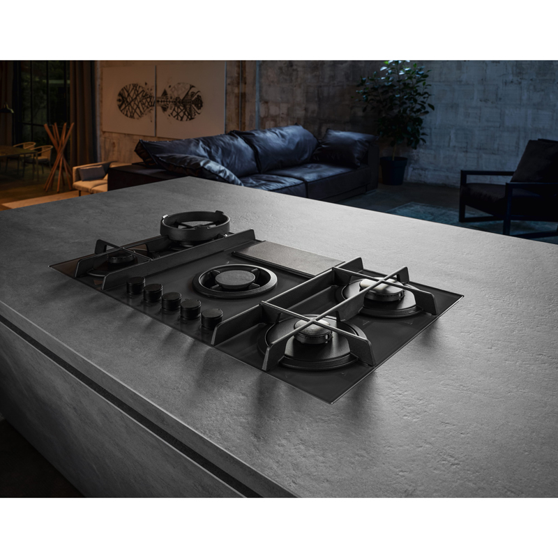 Η μαγεία της φλόγας συνδυάζεται με την ισχυρή τεχνολογία. Παρουσιάζουμε την πρώτη εστία με απορροφητήρα αερίου που συνδυάζει σύστημα απορρόφησης από κάτω με συμβατικούς καυστήρες. Με απόλυτη ασφάλεια: η συσκευή συμμορφώνεται με όλους τους κανονισμούς για την απόδοση και ισχύ της φλόγας, προσφέροντας ταυτόχρονα εξαιρετικές επιδόσεις. Τα στοιχεία από χυτοσίδηρο συνδυάζουν αισθητική και λειτουργικότητα, ενώ οι σταυρωτές, κλειστές, επίπεδες σχάρες καυστήρων παρέχουν σταθερή επιφάνεια για τις κατσαρόλες και επιτρέπουν την εύκολη μετακίνησή τους πάνω στην εστία. Το κάλυμμα φίλτρου από χυτοσίδηρο λειτουργεί και ως μοναδικό τρίποδο· η προαιρετική βάση για wok επεκτείνει τις δυνατότητες μαγειρέματος. Το ενσωματωμένο σύστημα απορρόφησης καθαρίζει τον αέρα από καπνούς και δυσάρεστες οσμές, ακόμα και αυτόματα, χάρη στο πολυλειτουργικό φίλτρο λίπους, οσμών και υγρασίας που εξασφαλίζει μέγιστη απόδοση και εύκολη συντήρηση.