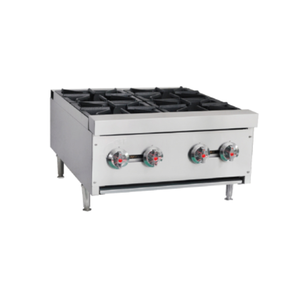 Επιτραπέζια, ανοξείδωτη. Διαθέτει 4 εστίες. Βαρέως τύπου. Με θερμοστάτη ασφαλείας και πιλότο. Λεκανάκι για την περισυλλογή λαδιών.