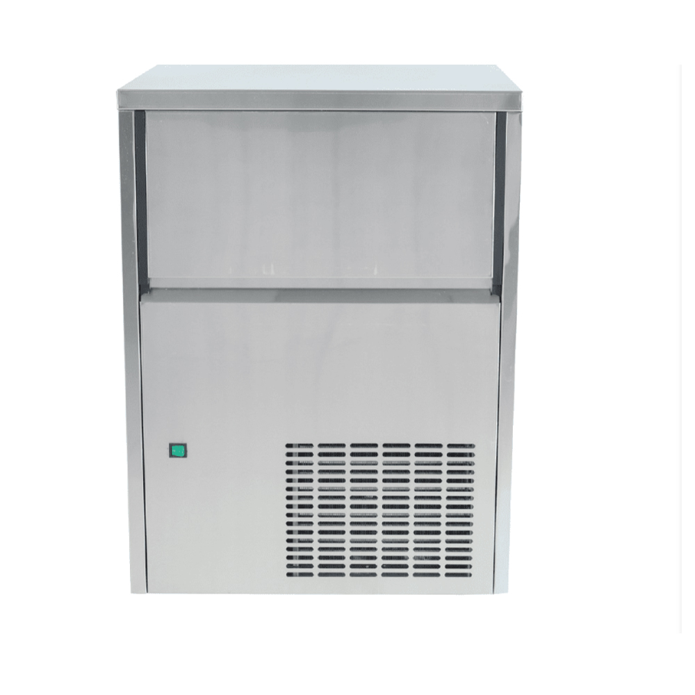 Ανοξείδωτη με ενσωματωμένη αποθήκη. Ψεκασμού, αερόψυκτη. Συμπαγές παγάκι διαστάσεων 32x32x32 mm βάρους 20 γραμμαρίων. Μονωμένη αποθήκη.