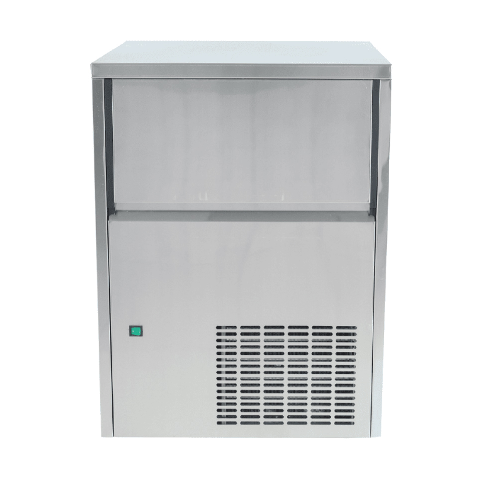 Ανοξείδωτη με ενσωματωμένη αποθήκη. Ψεκασμού, αερόψυκτη. Συμπαγές παγάκι διαστάσεων 32x32x32 mm βάρους 20 γραμμαρίων. Μονωμένη αποθήκη.
