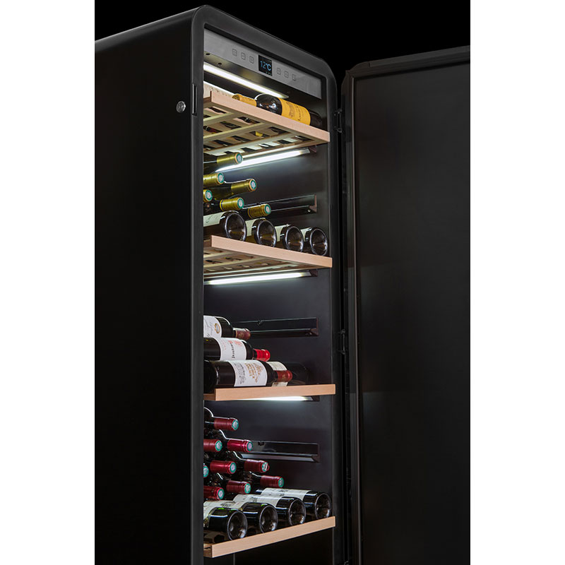 Φωτίστε τα μπουκάλια σας με το ενσωματωμένο σύστημα φωτισμού κάτω από τα ράφια. Αυτό το σύστημα σας επιτρέπει να φωτίσετε ολόκληρο το κελάρι κρασιών σας. Αποθηκεύστε έως και 185 φιάλες στα 5 ξύλινα ράφια του, αφαιρούμενα και πολλαπλών μορφών, είναι ειδικά σχεδιασμένα για να φιλοξενούν διάφορους τύπους φιαλών (Alsatian, Burgundy, Champenoise) και προσαρμόζονται στις ανάγκες σας (3 ράφια head to head position + 2 ράφια οριζόντια θέση).