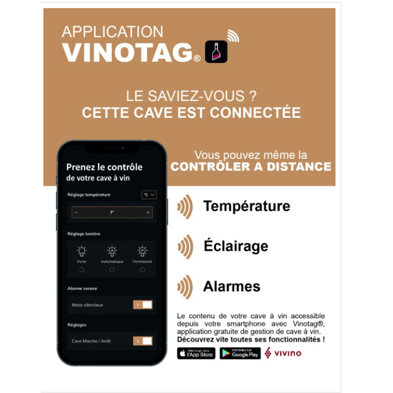Εξοπλισμένο με λειτουργία τηλεχειρισμού, ελέγξτε τις ρυθμίσεις της κάβας σας (θερμοκρασία, φωτισμός, συναγερμοί) ανά πάσα στιγμή και από απόσταση, χρησιμοποιώντας την εφαρμογή Vinotag® στο smartphone σας.