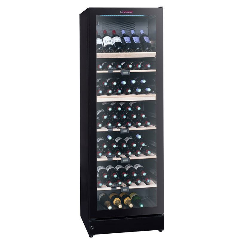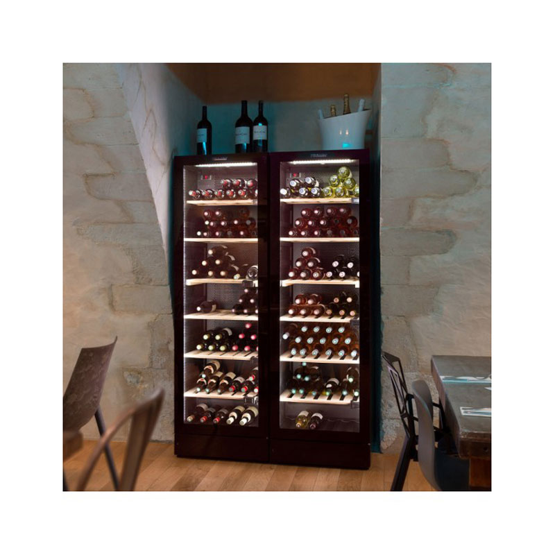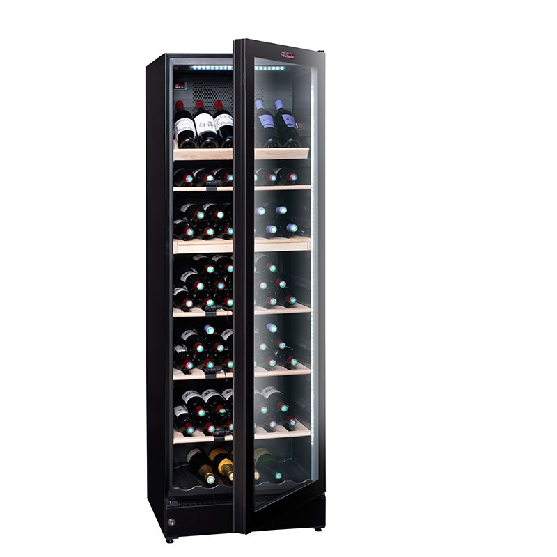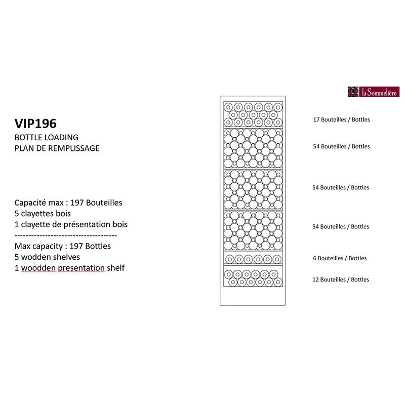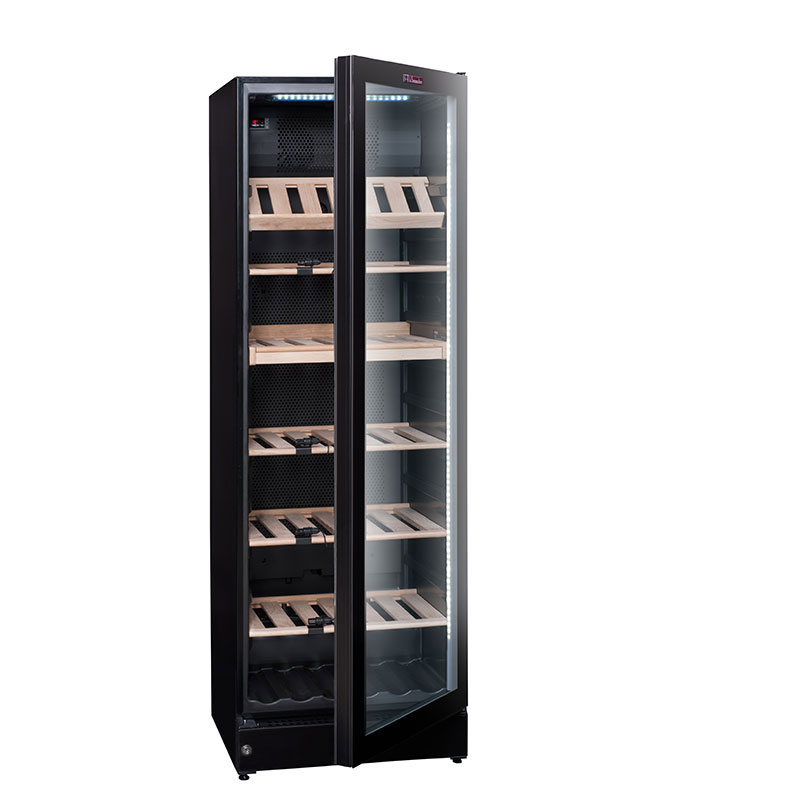 Το κελάρι κρασιών VIP196 είναι ένα κελάρι προετοιμασίας ή παλαίωσης κρασιού και μπορεί να χρησιμοποιηθεί για την αποθήκευση έως και 195 φιαλών (στην τυπική διαμόρφωση, δηλαδή με τα αρχικά εξαρτήματα κάβας). Το εξαιρετικά κομψό VIP196 είναι επικαλυμμένο σε μαύρο χρώμα και προσφέρει ένα σχέδιο που ταιριάζει ιδιαίτερα σε ένα προσεκτικά διακοσμημένο σαλόνι ή εστιατόριο. Ο φωτισμός του είναι ένα από τα αγαπημένα οπτικά χαρακτηριστικά των πελατών μας: τα μπλε LED ενισχύουν αναμφισβήτητα τα μπουκάλια σας και προσθέτουν μια άλλη διάσταση στα μπουκάλια που εκτίθενται.