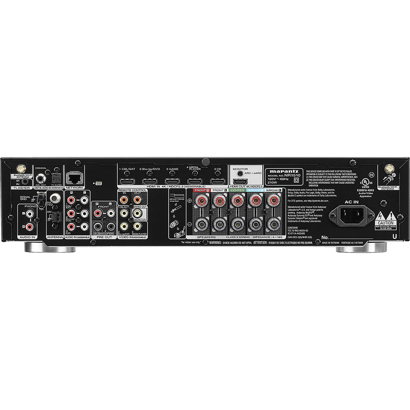 Ο Marantz NR-1510 ειναι ραδιοενισχυτής home cinema 5.2 καναλιων 5x50 watts, με ραδιοφωνικο δεκτη FM. Υποστηριζει Dolby Atmos, DTS:X, 4K60Hz, eARC, HDR10, Dolby Vision, HLG, DSD, Apple AirPlay 2, Alexa, Google Home. Ασυρματη διασυνδεσιμοτητα μεσω Wi-Fi, Bluetooth, Heos. Ενσυρματη διασυνδεσιμοτητα μεσω USB, HDMI, RCA, Coaxial, Optical.
