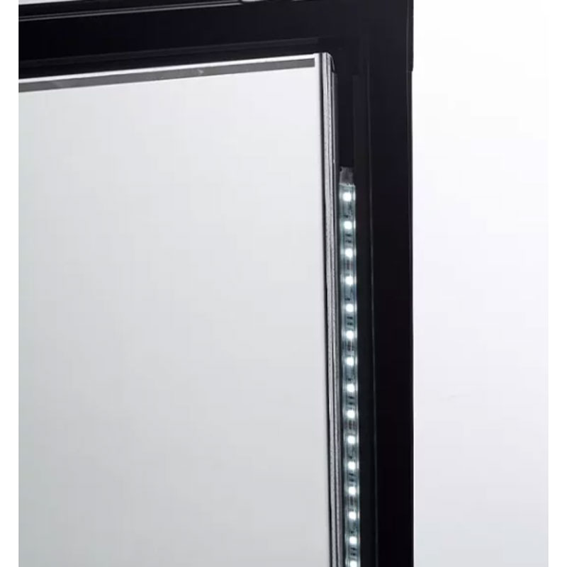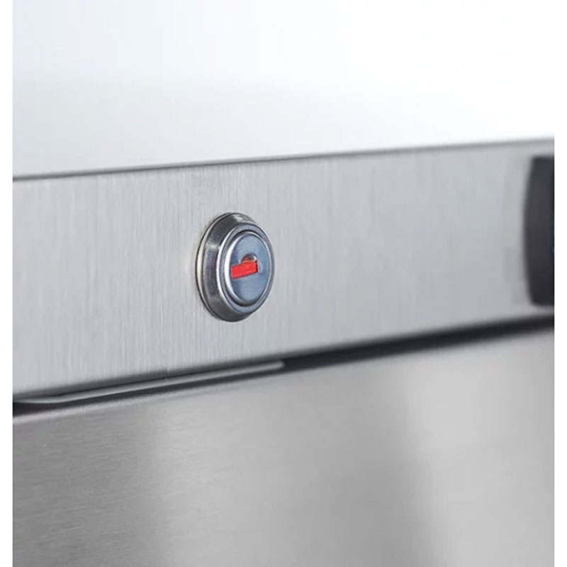 Εξοπλισμένο με κλειδαριά, εξωτερικό από ανοξείδωτο ατσάλι και εσωτερικό από θερμοδιαμορφωμένο πλαστικό, 6 σταθερά ράφια, αναστρέψιμη γυάλινη πόρτα με τριπλό γυαλί και αυτόματο κλείσιμο , κάθετο led φωτισμό για καλύτερη προβολή των προϊόντων στο εσωτερικό και 4 ρόδες με 2 φρένα. Υπάρχει η δυνατότητα να τοποθετηθούν στο εσωτερικό 14 καλάθια στο ως τρόπο οργάνωσης και διαχωρισμού των προϊόντων προς συντήρηση.