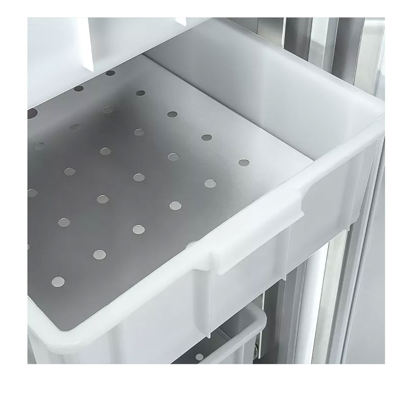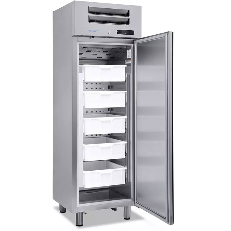 Επαγγελματικός εξοπλισμός ειδικά σχεδιασμένος για τη συντήρηση φρέσκων ψαριών, με τέλειο συνδυασμό σχεδιασμού και λειτουργικότητας. Ο εξοπλισμός διαθέτει στάνταρ 5 πλαστικούς δίσκους για ψάρια με πυθμένα από διάτρητο χάλυβα, αποφεύγοντας τα ψάρια να έρχονται σε άμεση επαφή με το νερό. Λόγω των μικρών διαστάσεων, είναι ο ιδανικός εξοπλισμός για μικρές κουζίνες ή χώρους σνακ. Το εσωτερικό από ανοξείδωτο χάλυβα, μόνωση 60 mm και αεριζόμενο κρύο εγγυάται την ομοιομορφία της θερμοκρασίας στο εσωτερικό και γρήγορη ανάκτηση μετά το άνοιγμα της πόρτας. Το νερό από την αυτόματη απόψυξη πηγαίνει απευθείας σε ένα δίσκο που βρίσκεται στο κάτω μέρος της μονάδας. Standard με κλειδαριά πόρτας, αναστρέψιμη πόρτα με αυτόματη επιστροφή σε κλειστή θέση και ρυθμιζόμενα πόδια inox.