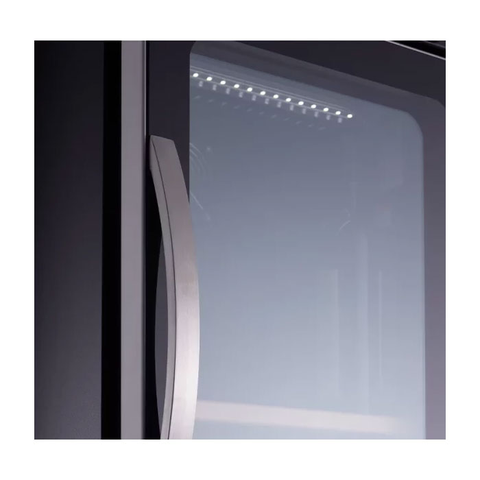 Εξοπλισμένος με κλειδαριά, εξωτερικό σε μαύρο skinpkate και εσωτερικό σε θερμοδιαμορφωμένο πλαστικό, 5 αφαιρούμενα ράφια σε ξύλο, αναστρέψιμη διπλή γυάλινη πόρτα με αυτόματο κλείσιμο, κάθετο φωτισμό led για καλύτερη προβολή των προϊόντων στο εσωτερικό και 4 ροδάκια με 2 ρυθμιζόμενα ποδαράκια