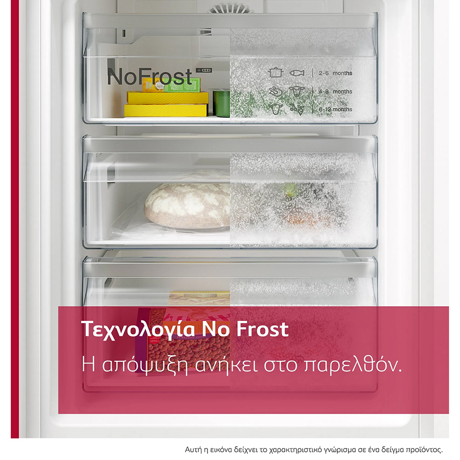 Τεχνολογία No Frost: η απόψυξη ανήκει στο παρελθόν. Χάρη στο No Frost, ο ξηρός αέρας κατανέμεται ομοιόμορφα στο εσωτερικό του καταψύκτη.Επειδή δεν υπάρχει υγρασία, δεν σχηματίζεται πάγος, οπότε μπορείτε να ξεχάσετε μια για πάντα την ταλαιπωρία της απόψυξης.