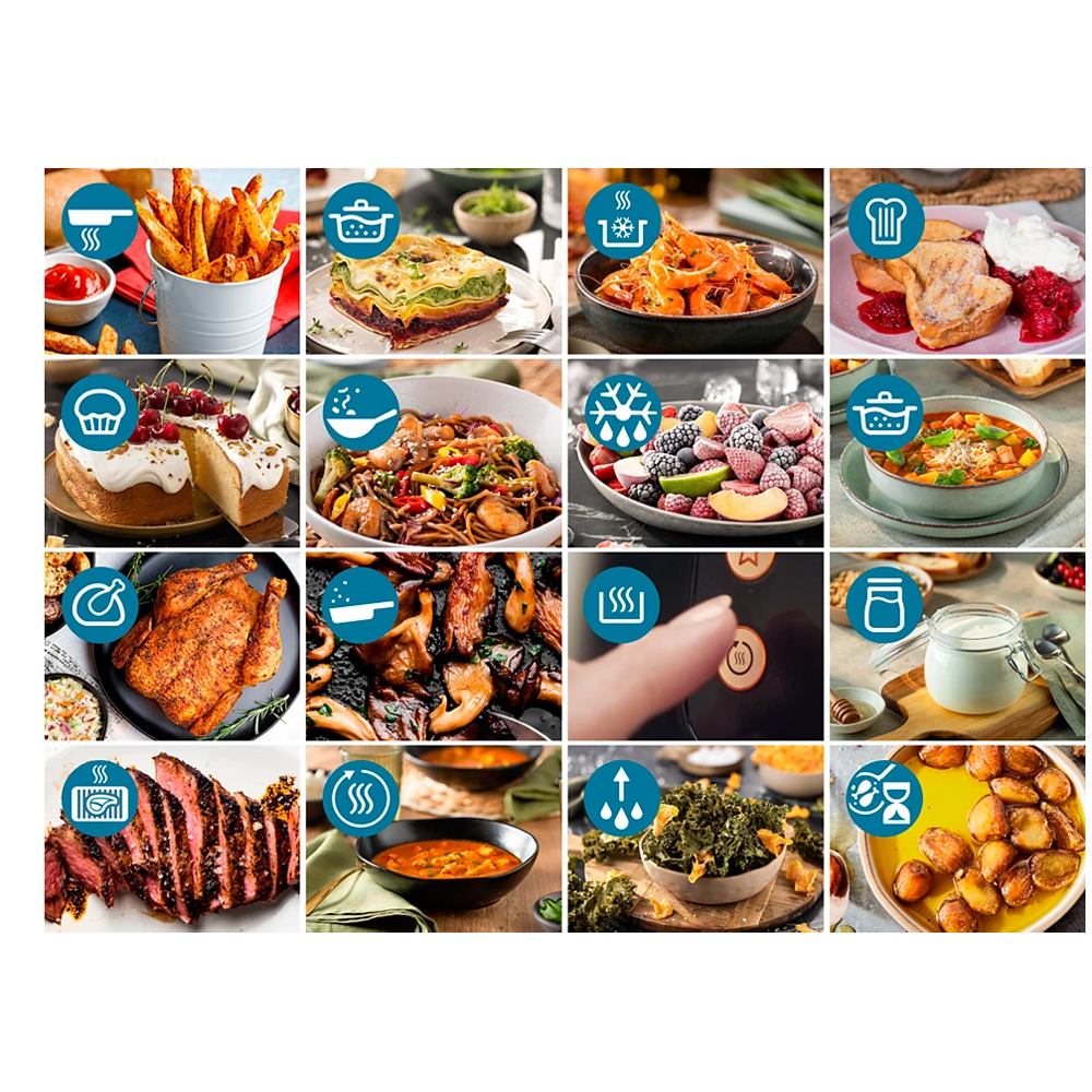Επιλέξτε ανάμεσα από 16 λειτουργίες μαγειρέματος, από ψήσιμο και γκριλ μέχρι απόψυξη και ξαναζέσταμα. Οι ρυθμίσεις φτάνουν έως τους 40℃ και τις 24 ώρες για αφυδάτωση και ζύμωση.