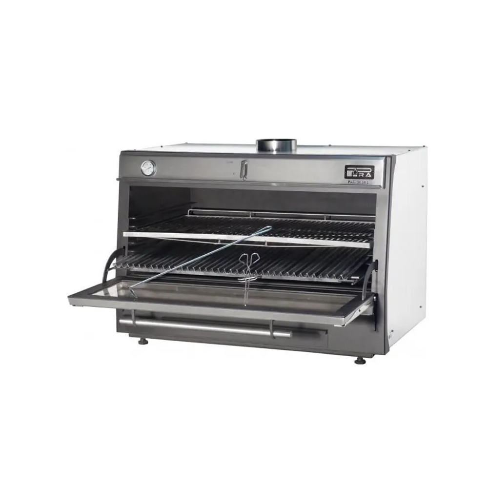 Φούρνοι με ξυλοκάρβουνο PIRA Ισπανίας. Θα πετύχετε την αυθεντική γεύση, την τέλεια υφή και θα κρατήσετε το προϊόν ζουμερό. Μαγειρέψτε κρεατικά, ψάρια, λαχανικά. Δεν χρειάζεστε καθόλου ρεύμα ή υγραέριο. Μπορείτε να χρησιμοποιήσετε οποιοδήποτε ξυλοκάρβουνο ή ξυλοκάρβουνο ανανά. Κατασκευασμένος από μαντέμι. Διπλή μόνωση στα τοιχώματα. Γυάλινη πόρτα από ειδικό γυαλί NEOCERAM που αντέχει σε υψηλές θερμοκρασίες έως 750°C. Έτσι σας δίνεται η δυνατότητα να ελέγχετε την διαδικασία μαγειρέματος χωρίς να ανοίγετε την πόρτα. Έτσι καταναλώνετε λιγότερα ξυλοκάρβουνα. Φέρει συρτάρι λαδιού - λίπους για να αποφεύγονται οι φλόγες στην θαλάμη του φούρνου. Με δοχείο περισυλλογής της στάχτης. Εξωτερικό θερμόμετρο για την ένδειξη της θερμοκρασίας. Ανοξείδωτη σχάρα για το ψήσιμο. Συμπεριλαμβάνονται : μια ανοξείδωτη σχάρα, μια λαβίδα και ένα φτυάρι περισυλλογής. Τοποθετήστε 5 κιλά ξυλοκάρβουνο. Η "ένταση" των κάρβουνων μπορεί να ελεγχθεί ανοιγοκλείνοντας τα κλείστρα ρύθμισης ροής του αέρα και έτσι ρυθμίζουμε το οξυγόνο που έχει η θαλάμη. Με 8,5Kg ξυλοκάρβουνο λειτουργείτε τον φούρνο για 10 ώρες.