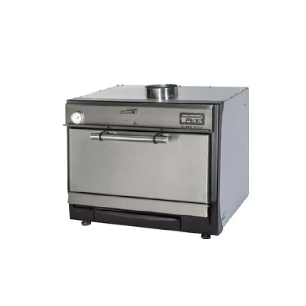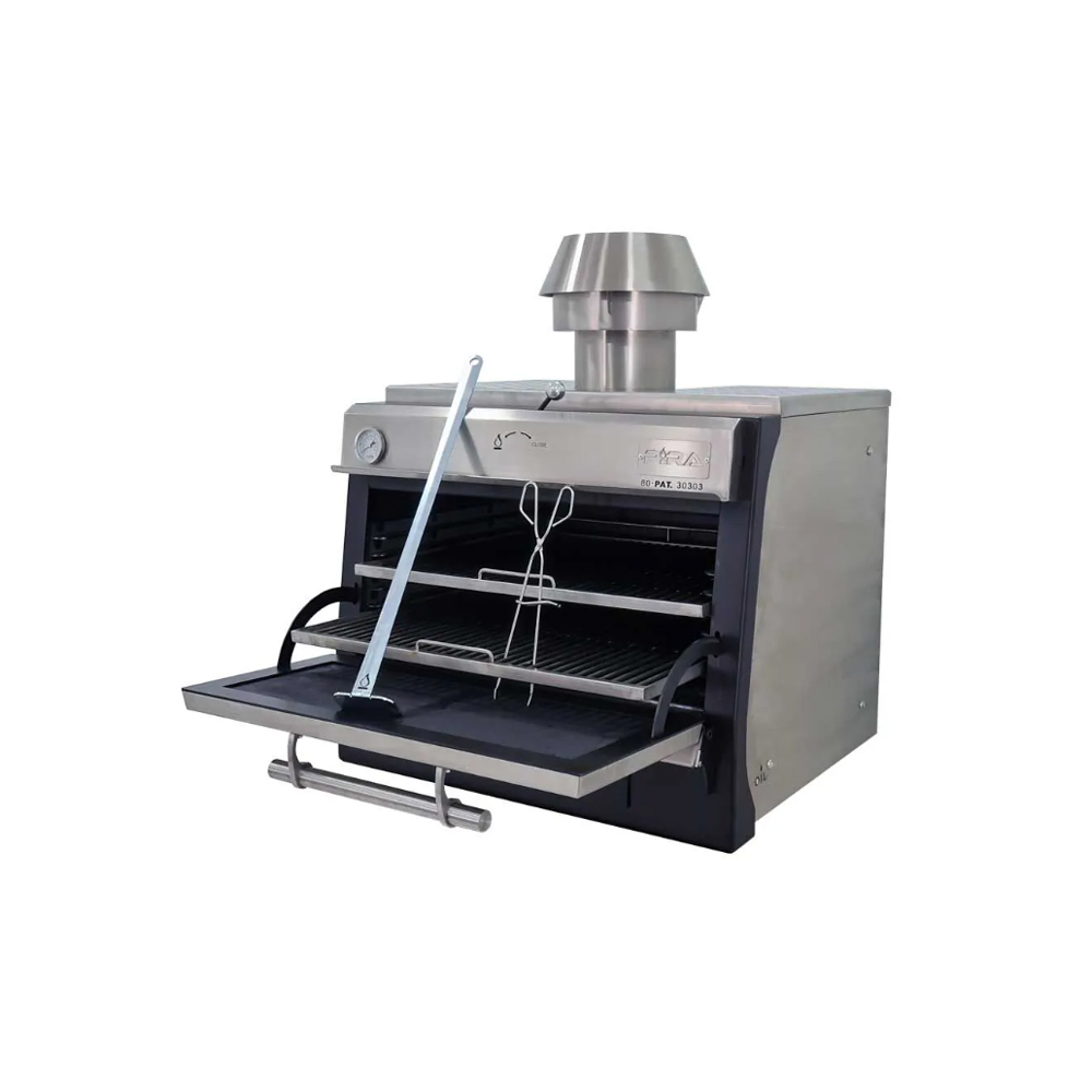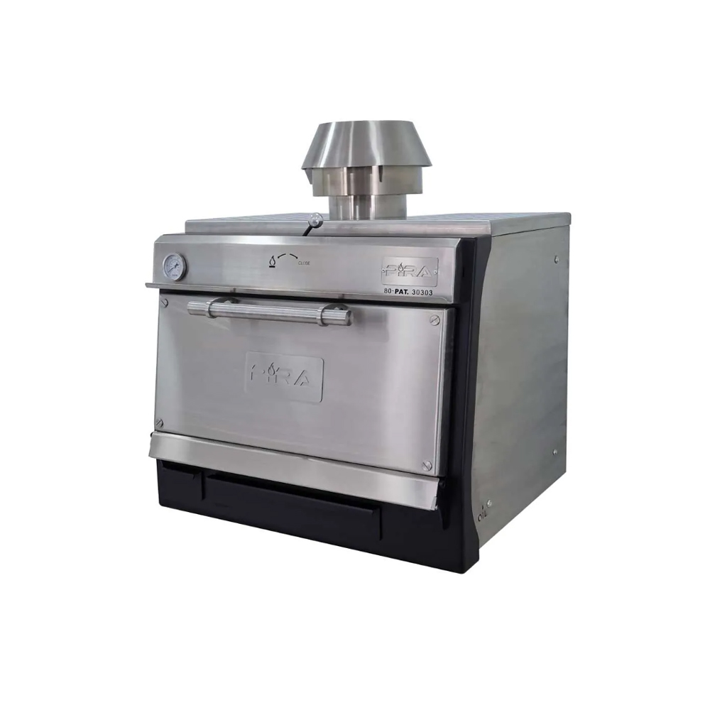 Φούρνοι με ξυλοκάρβουνο PIRA Ισπανίας. Θα πετύχετε την αυθεντική γεύση, την τέλεια υφή και θα κρατήσετε το προϊόν ζουμερό. Μαγειρέψτε κρεατικά, ψάρια, λαχανικά. Δεν χρειάζεστε καθόλου ρεύμα ή υγραέριο. Μπορείτε να χρησιμοποιήσετε οποιοδήποτε ξυλοκάρβουνο ή ξυλοκάρβουνο ανανά. Κατασκευασμένος από μαντέμι. Διπλή μόνωση στα τοιχώματα. Γυάλινη πόρτα από ειδικό γυαλί NEOCERAM που αντέχει σε υψηλές θερμοκρασίες έως 750°C. Έτσι σας δίνεται η δυνατότητα να ελέγχετε την διαδικασία μαγειρέματος χωρίς να ανοίγετε την πόρτα. Έτσι καταναλώνετε λιγότερα ξυλοκάρβουνα. Φέρει συρτάρι λαδιού - λίπους για να αποφεύγονται οι φλόγες στην θαλάμη του φούρνου. Με δοχείο περισυλλογής της στάχτης. Εξωτερικό θερμόμετρο για την ένδειξη της θερμοκρασίας. Ανοξείδωτη σχάρα για το ψήσιμο. Συμπεριλαμβάνονται : μια ανοξείδωτη σχάρα, μια λαβίδα και ένα φτυάρι περισυλλογής. Τοποθετήστε 5 κιλά ξυλοκάρβουνο. Η "ένταση" των κάρβουνων μπορεί να ελεγχθεί ανοιγοκλείνοντας τα κλείστρα ρύθμισης ροής του αέρα και έτσι ρυθμίζουμε το οξυγόνο που έχει η θαλάμη. Με 8,5Kg ξυλοκάρβουνο λειτουργείτε τον φούρνο για 10 ώρες.