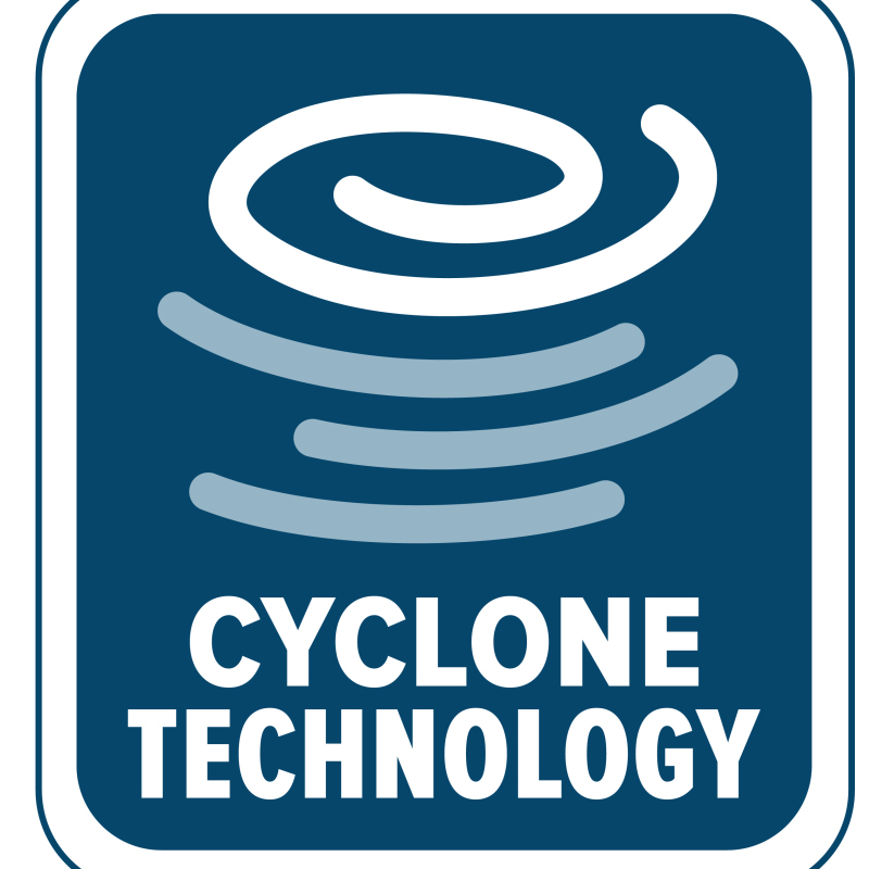 Με την κυκλωνική τεχνολογία, η σκόνη διαχωρίζεται αμέσως από τον αέρα με αποτέλεσμα μέγιστη απόδοση και εξαιρετικό καθαρισμό. Η περιστροφή του σκονισμένου αέρα είναι ένας αποτελεσματικός τρόπος διαχωρισμού της σκόνης από τον αέρα, καθώς διαχωρίζει τα βαριά σωματίδια σκόνης, τα οποία παγιδεύονται και μπορούν να συλλεχθούν. Επειδή δεν υπάρχει σακούλα που φράσσεται με τη σκόνη και τη βρωμιά, επιτυγχάνεται σταθερή ροή αέρα και υψηλή απορροφητικότητα.