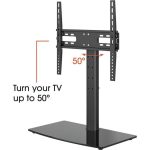 Με πλάκα βάσης 55 x 32 cm, δεν χρειάζεστε τόσο φαρδύ ντουλάπι τηλεόρασης όσο με τις κανονικές βάσεις τηλεόρασης. Η πλάκα βάσης είναι κατασκευασμένη από σκληρυμένο γυαλί και εξασφαλίζει ότι η τηλεόρασή σας είναι εξαιρετικά σταθερή. Κατά την εγκατάσταση, επιλέγετε το ύψος στο οποίο θα τοποθετήσετε την τηλεόρασή σας. Μπορείτε εύκολα να περιστρέψετε την τηλεόραση έως και 50° προς την αγαπημένη σας καρέκλα.